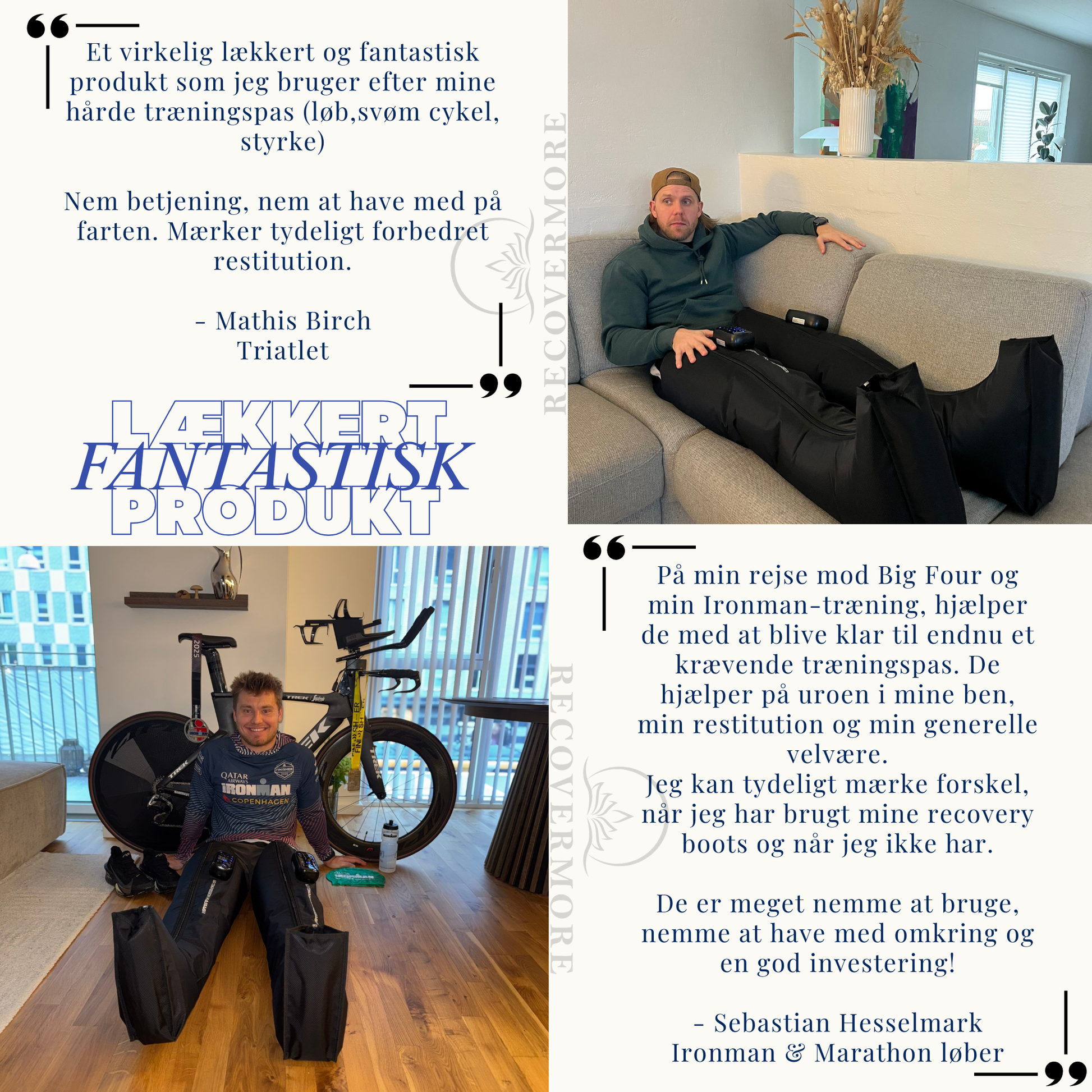 Fantastisk produkt – både til sport og genoptræning! Recovermore Boots har virkelig gjort en forskel hjemme hos os. Mine to drenge, der spiller elitefodbold, bruger dem efter træning og kamp, og jeg selv har haft stor gavn af dem til mit hævede knæ. Let at bruge, effektivt og en ren fornøjelse hver gang!