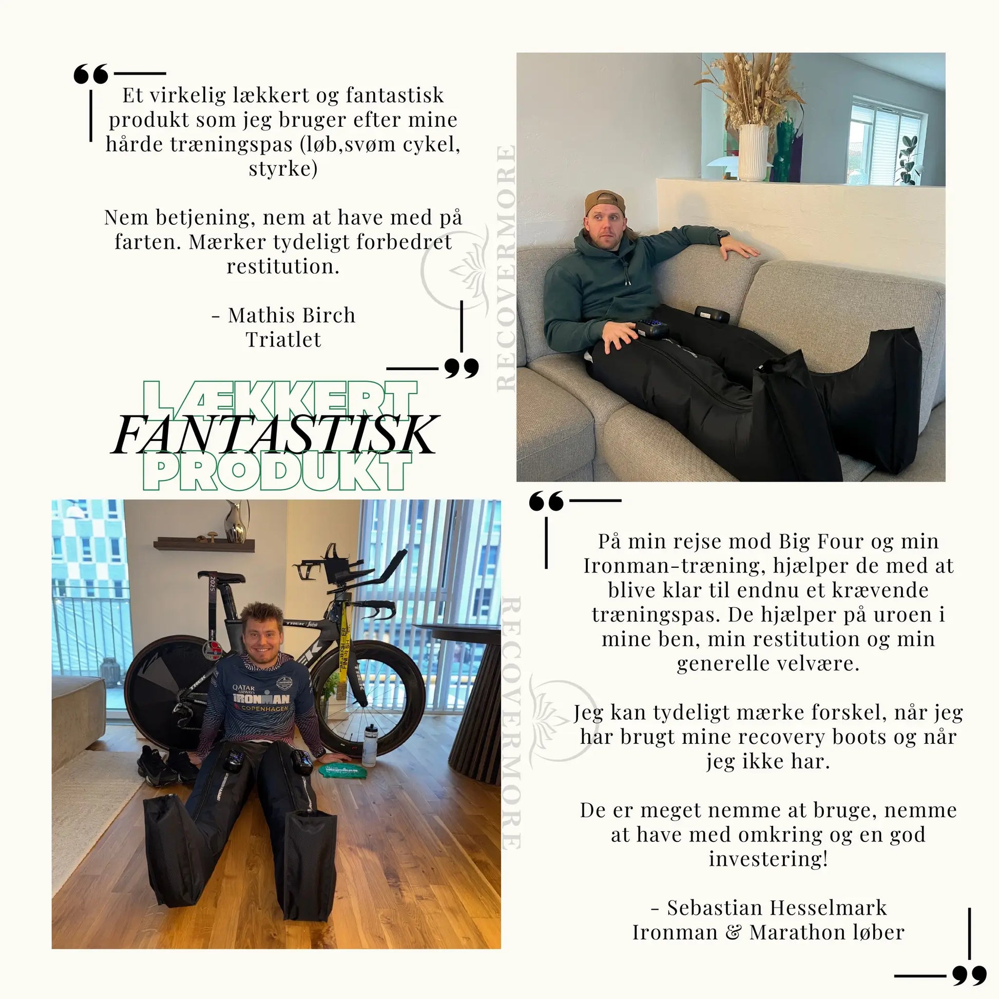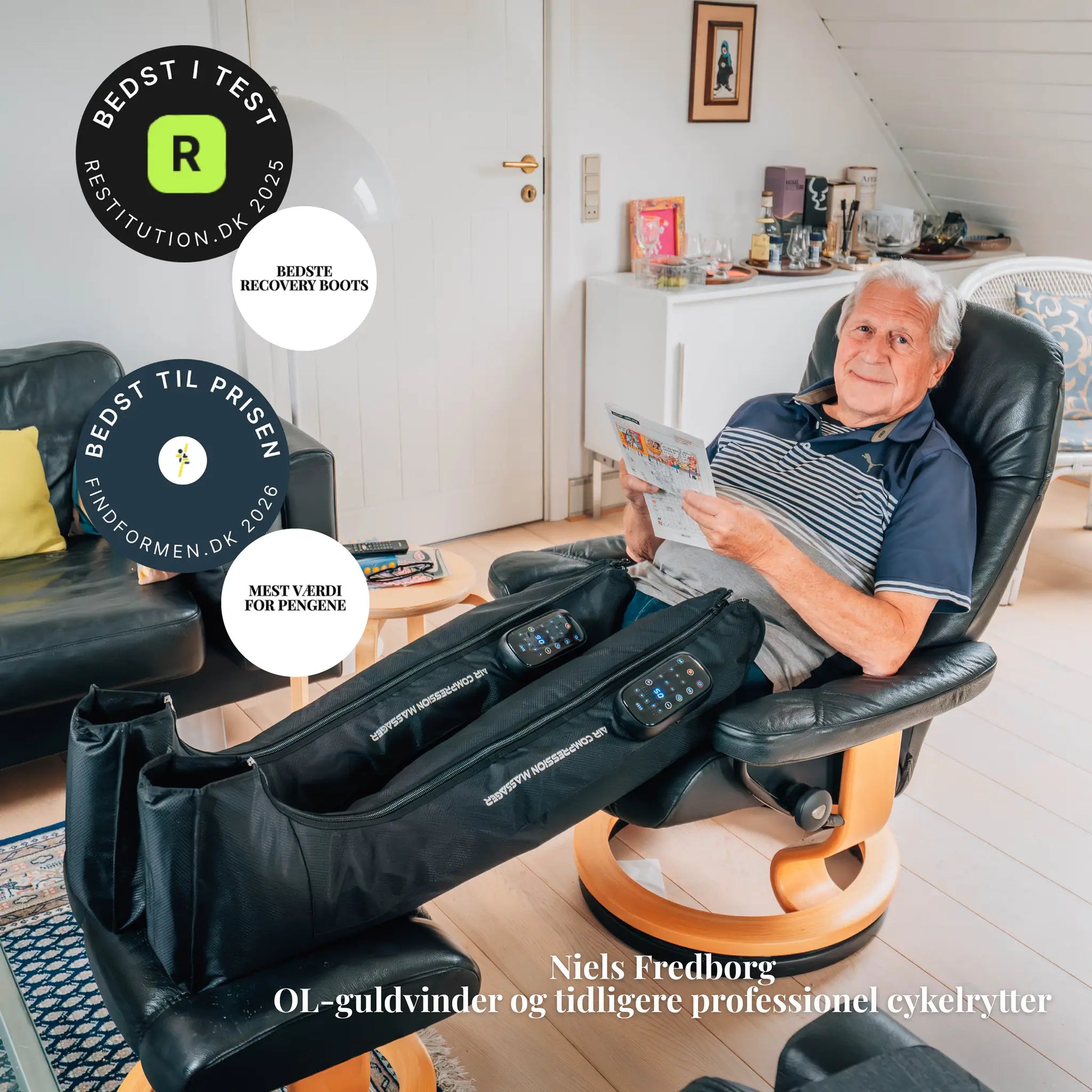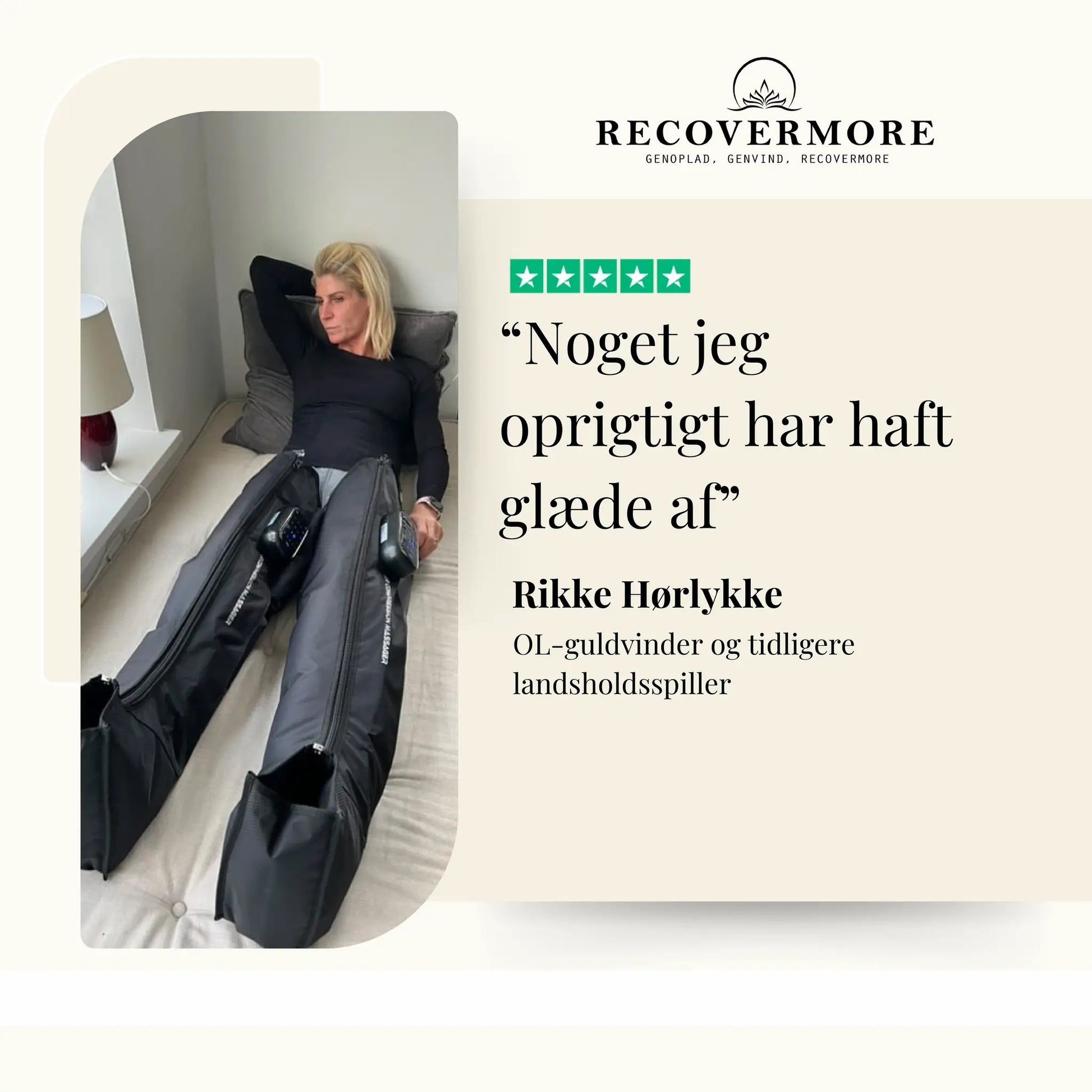 "Efter 25+ år som behandler inden for massage og smertebehandling kan jeg fagligt anbefale RecoverMore Recovery Boots. De giver en mærkbar forbedring af restitutionen, og benene føles både lettere og mindre hævede efter brug."